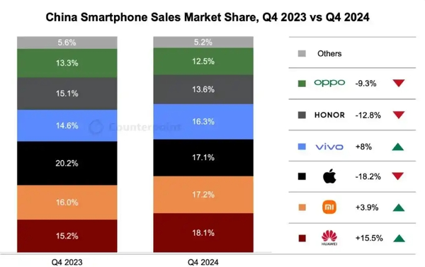 此外,凭据Counterpoint最新数据,2024年第四季度,华为以18.1%的市集份额位居榜首,小米紧随后来,以17.2%的市集份额位列第二,vivo和OPPO则永别以16.3%和12.5%的市集份额占据第四和第六的位置。